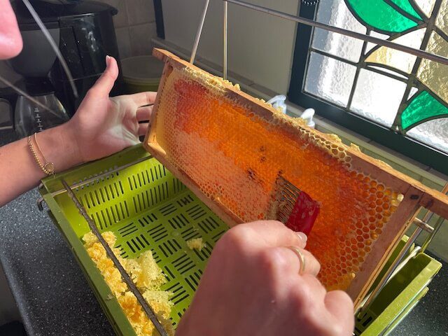 Deborah en Caroline mochten onze imker Wout helpen met het slingeren van de honing van de bijen op Geestmerloo. Een bij-zonder klusje. Na een dagje hard werken is er zo’n 60 kilo honing geoogst. Hoeveel kilometers vliegen is dat?!