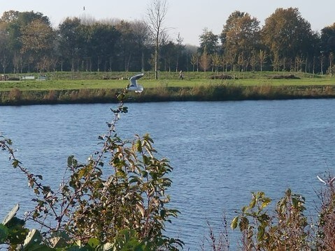 Als je een stukje verder loopt kom je vanzelf weer bij de ingang van de natuurbegraafplaats. Ik loop dan weer verder naar het graf waar mijn vrouw is begraven. Ze ligt op het kleine eiland, met uitzicht over het water en in de verte de duinen. En ook met uitzicht op het Bos der Omarming.